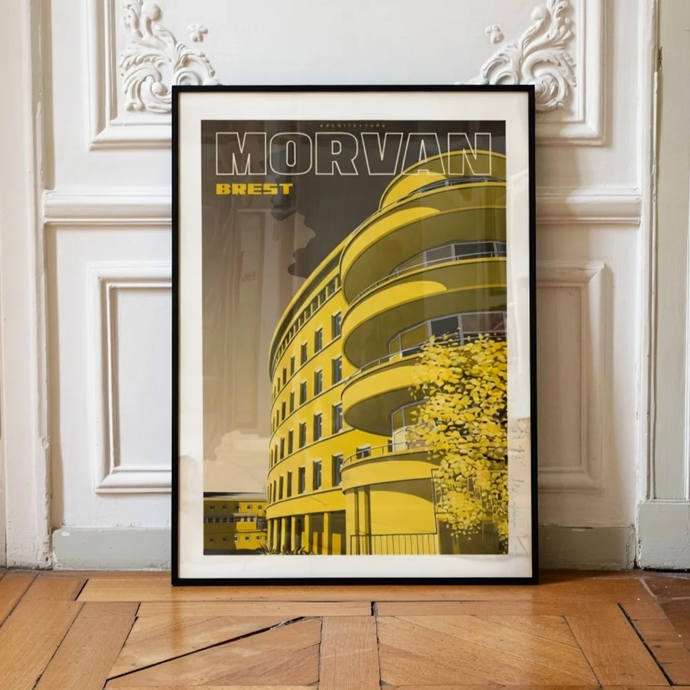 Faites entrer l’énergie de l’architecture brestoise dans votre maison avec notre affiche de l’Hôpital Morvan. Monument phare du paysage urbain de Brest, ce complexe architectural est un témoignage exceptionnel de l’Art Déco, célébré pour ses volumes audacieux et ses lignes symétriques.